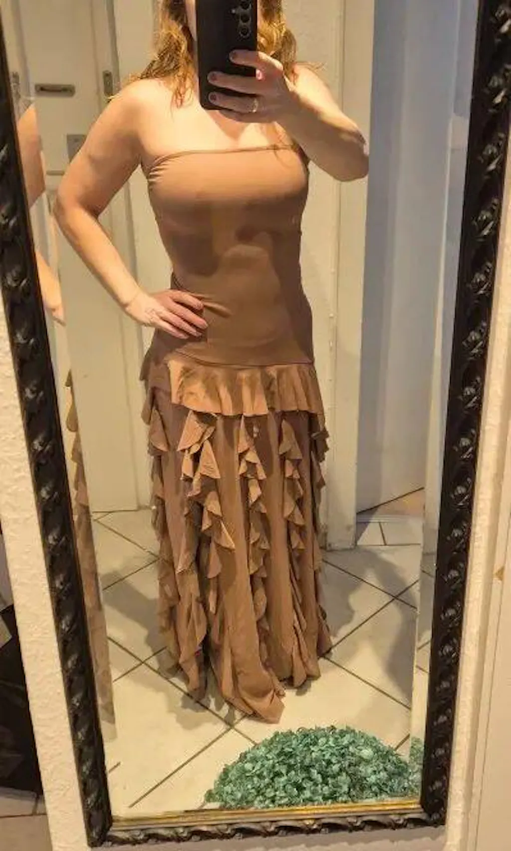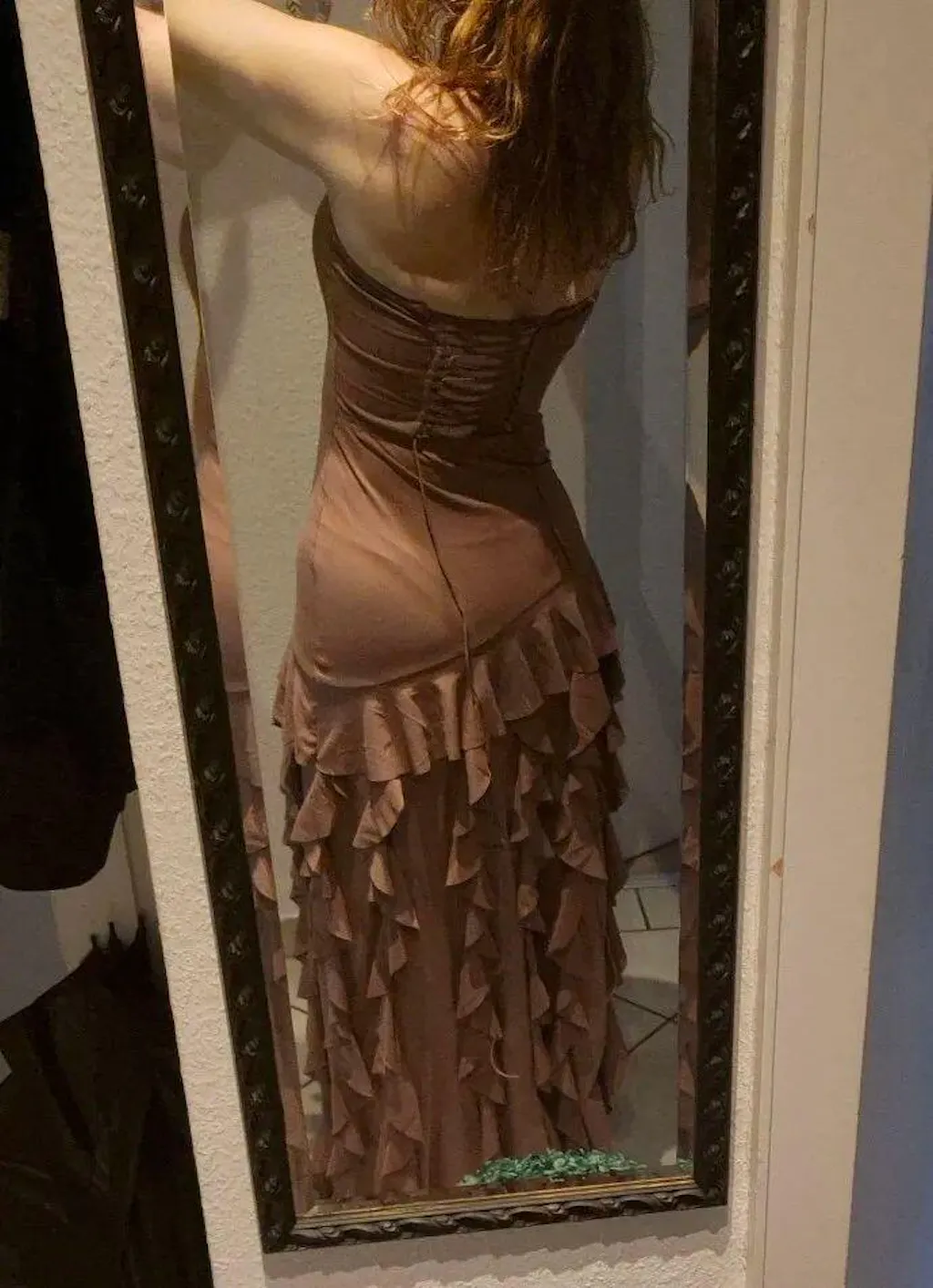 - Silhueta: Ajustada com saia em babados plissados