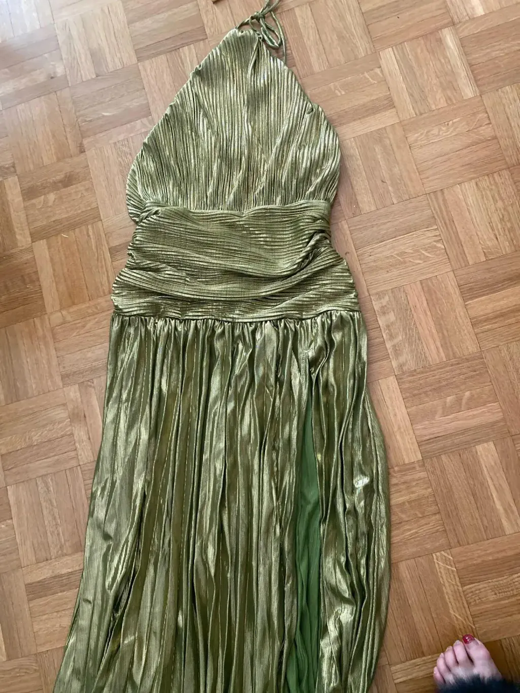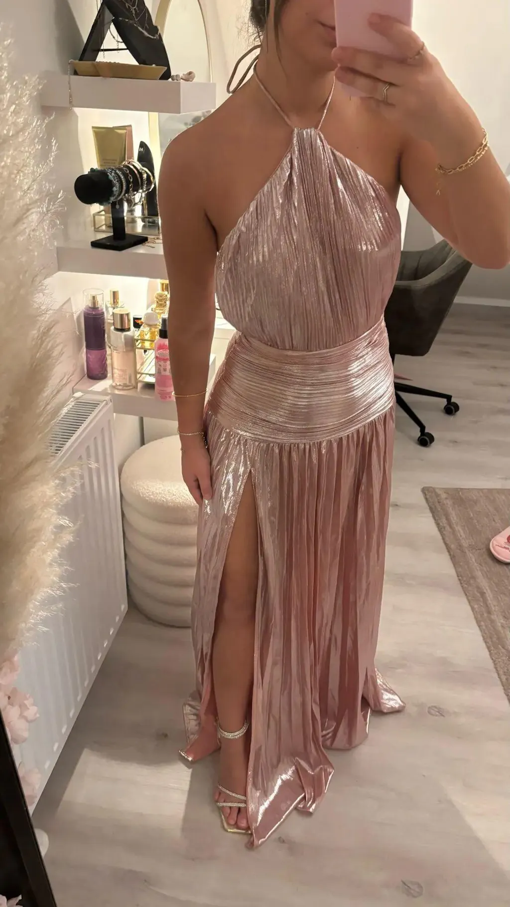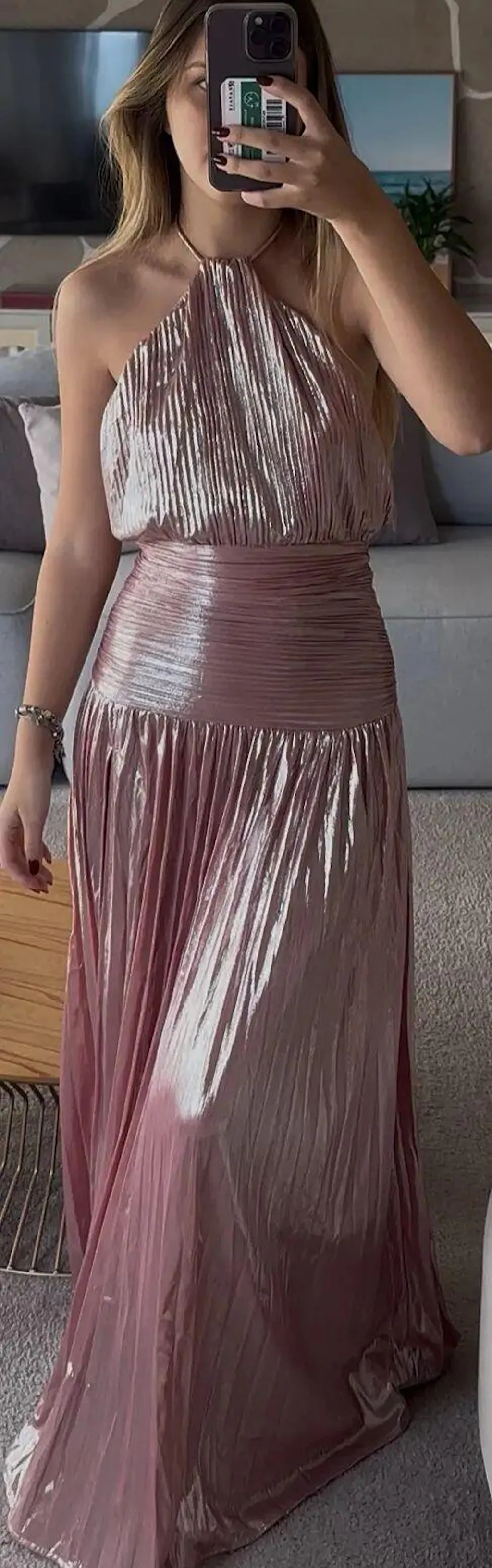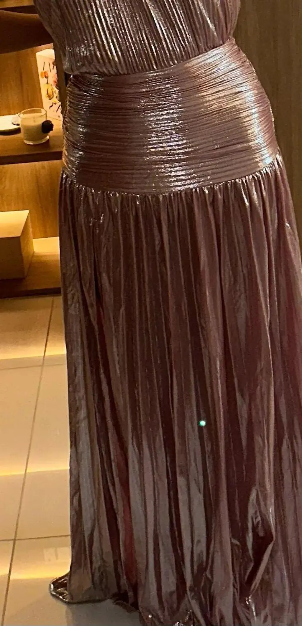 - Detalhes que Encantam: O decote Halter e a modelagem sem mangas realçam os ombros de forma sensual, enquanto o design fora do ombro confere um toque moderno. O destaque principal são as dobras do tecido, que criam um efeito visual de luz e sombra, adicionando profundidade e um brilho sutil à peça. A fenda na saia, cuidadosamente posicionada, garante liberdade e um charme extra.