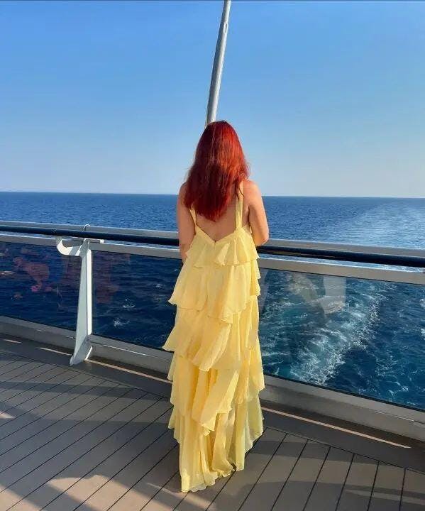 - Detalhes que Encantam: Os babados em cascata são o ponto alto do design, criando volume e leveza. O decote em V delicado e o fechamento em renda (lace-up) nas costas adicionam um toque romântico e ajustável. O padrão listrado e a impressão no tecido dão um toque de personalidade e modernidade à peça.