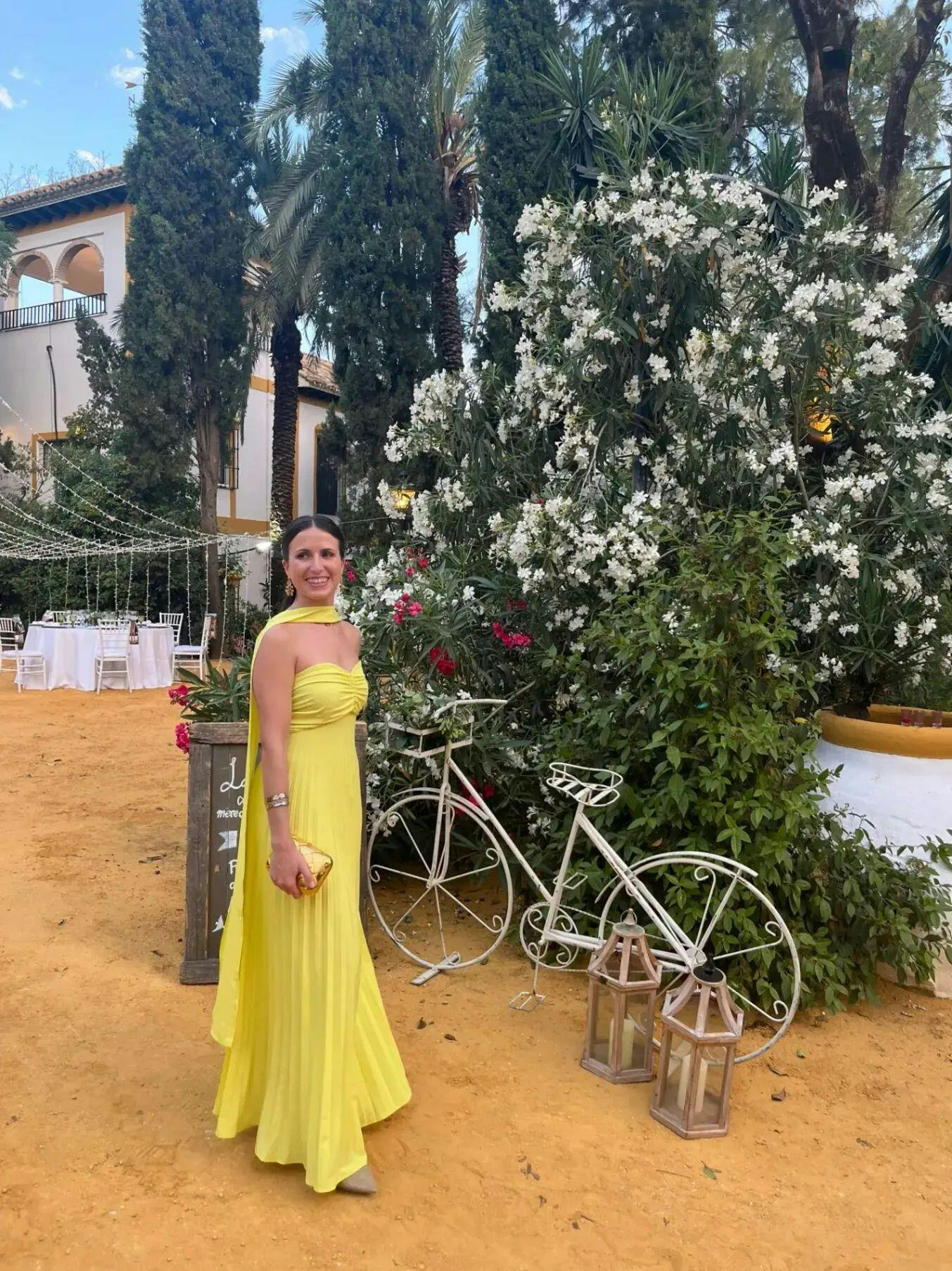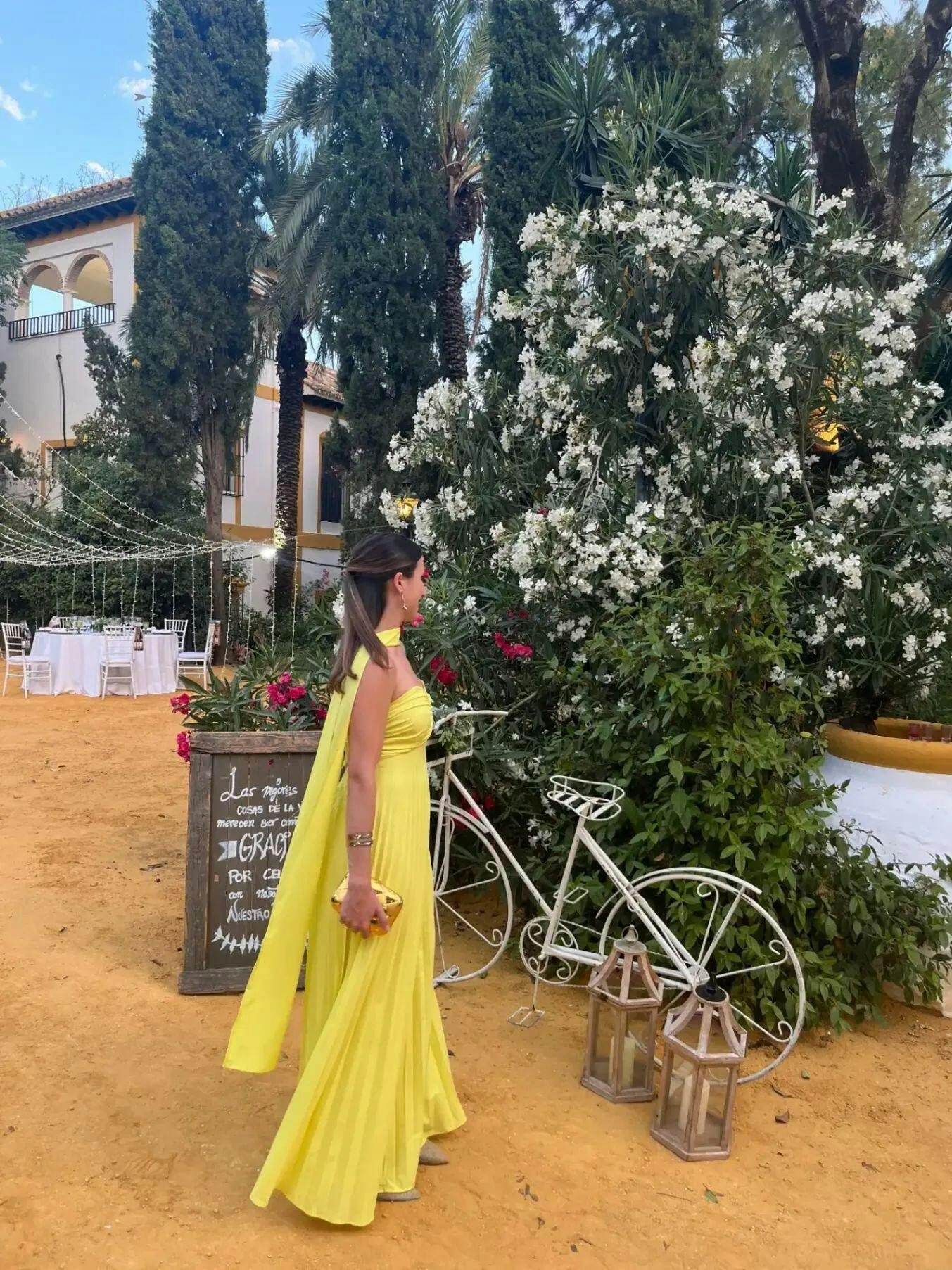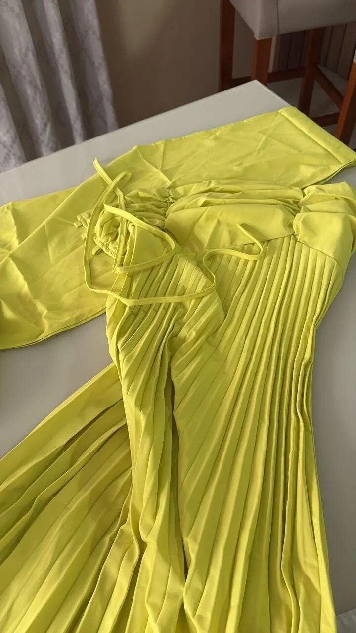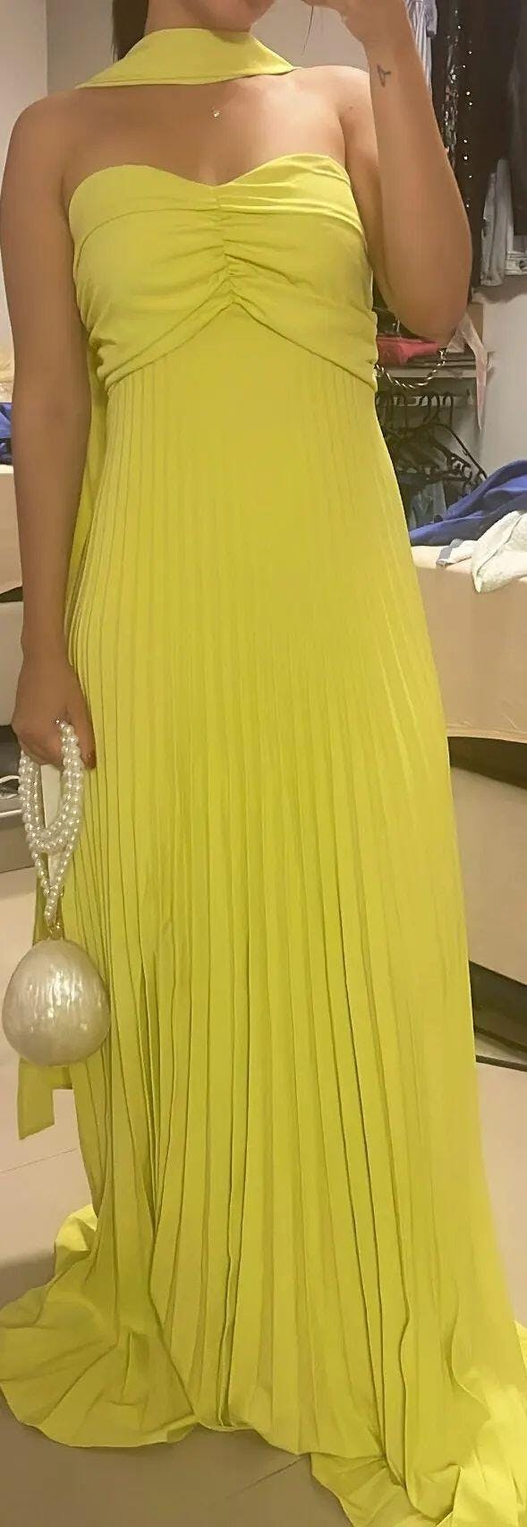- Corpo Drapeado: O busto ajustado com um drapeado delicado realça a silhueta de forma refinada. O detalhe da faixa que se estende ao pescoço não só confere um visual único, mas também adiciona um toque chic e funcional, mantendo o vestido no lugar com elegância.