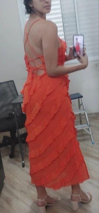 - Cascata de Babados: O grande destaque da peça é a cascata de babados que flui do decote até a bainha. Esse detalhe cria um movimento deslumbrante e adiciona uma dimensão luxuosa, enquanto a fenda lateral, cuidadosamente posicionada, garante liberdade e um toque de ousadia.