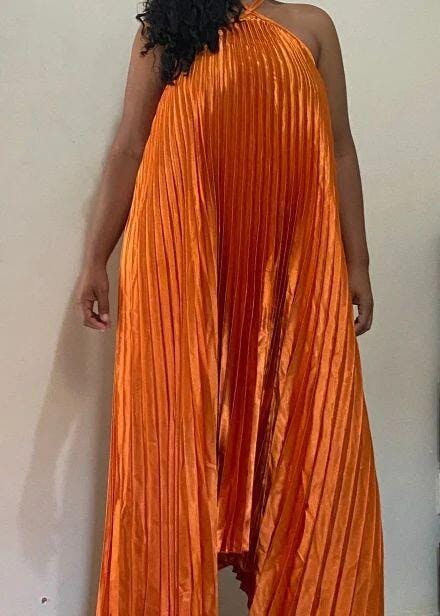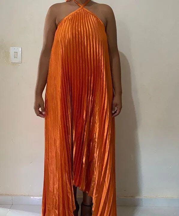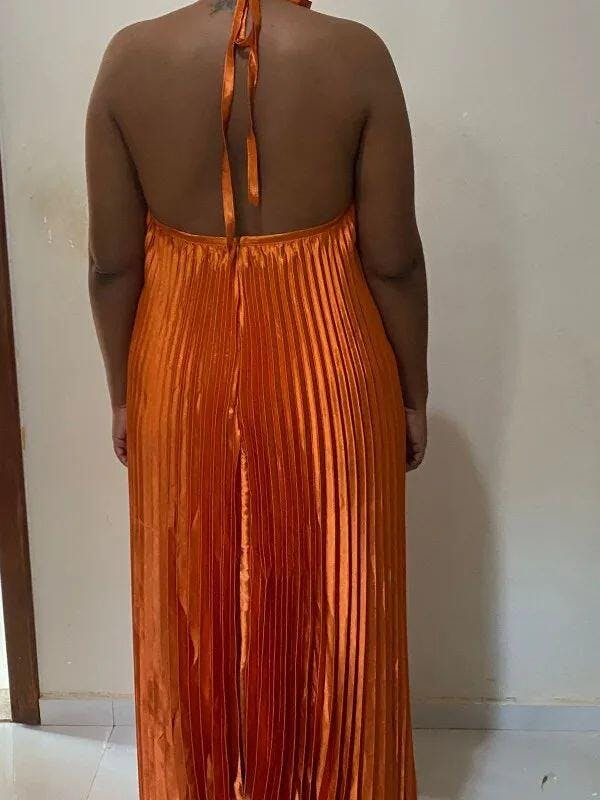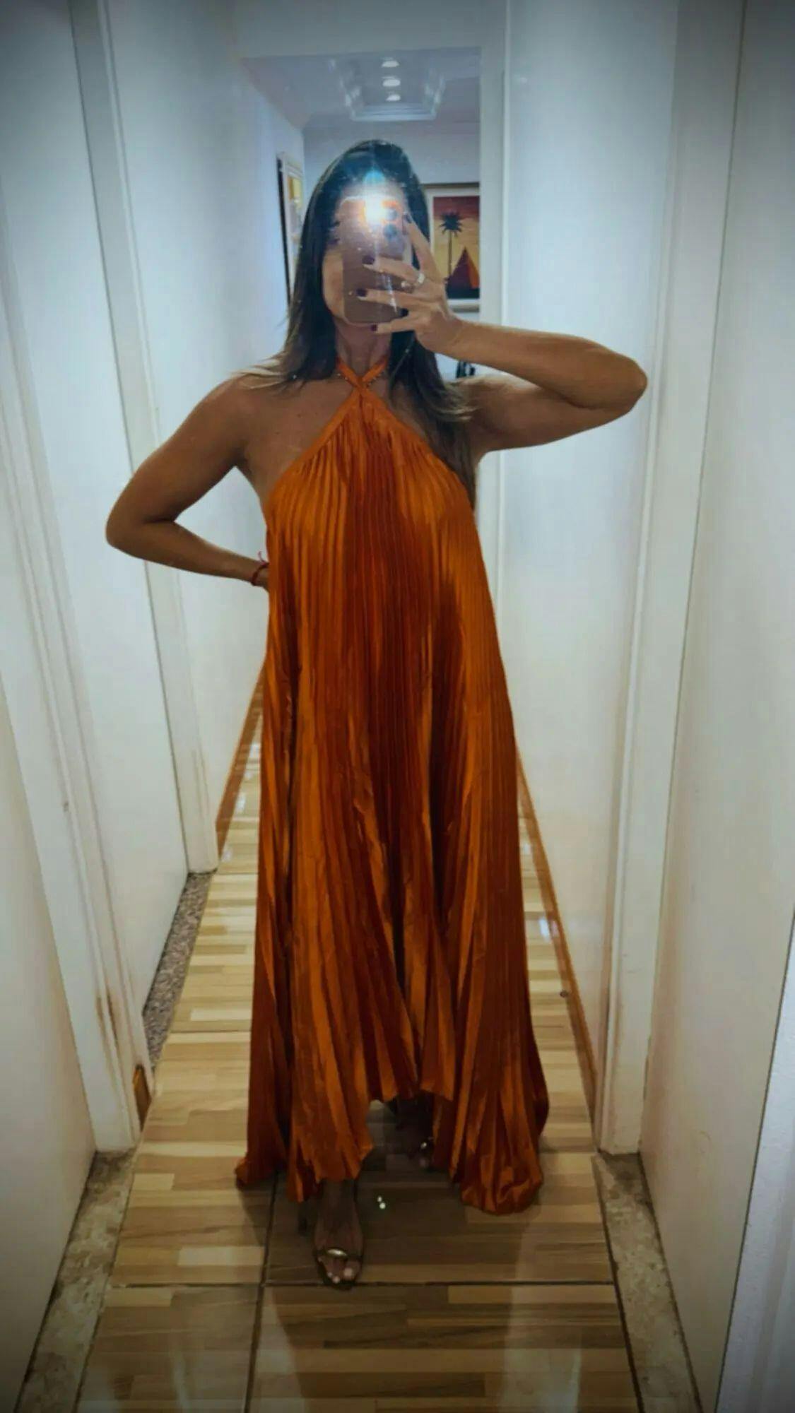 - Plissado Majestoso: A principal característica desta peça é a sua cascata de plissados. Eles conferem uma textura visual incrível e um movimento fluido que transforma cada passo em uma dança. A silhueta solta e o caimento A-line garantem conforto total sem perder a elegância.