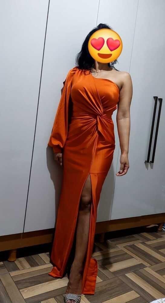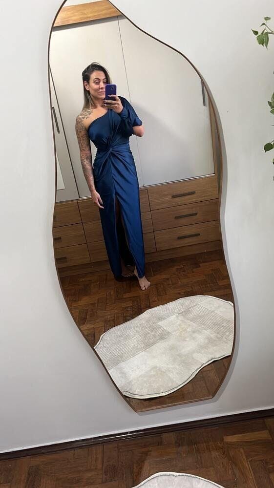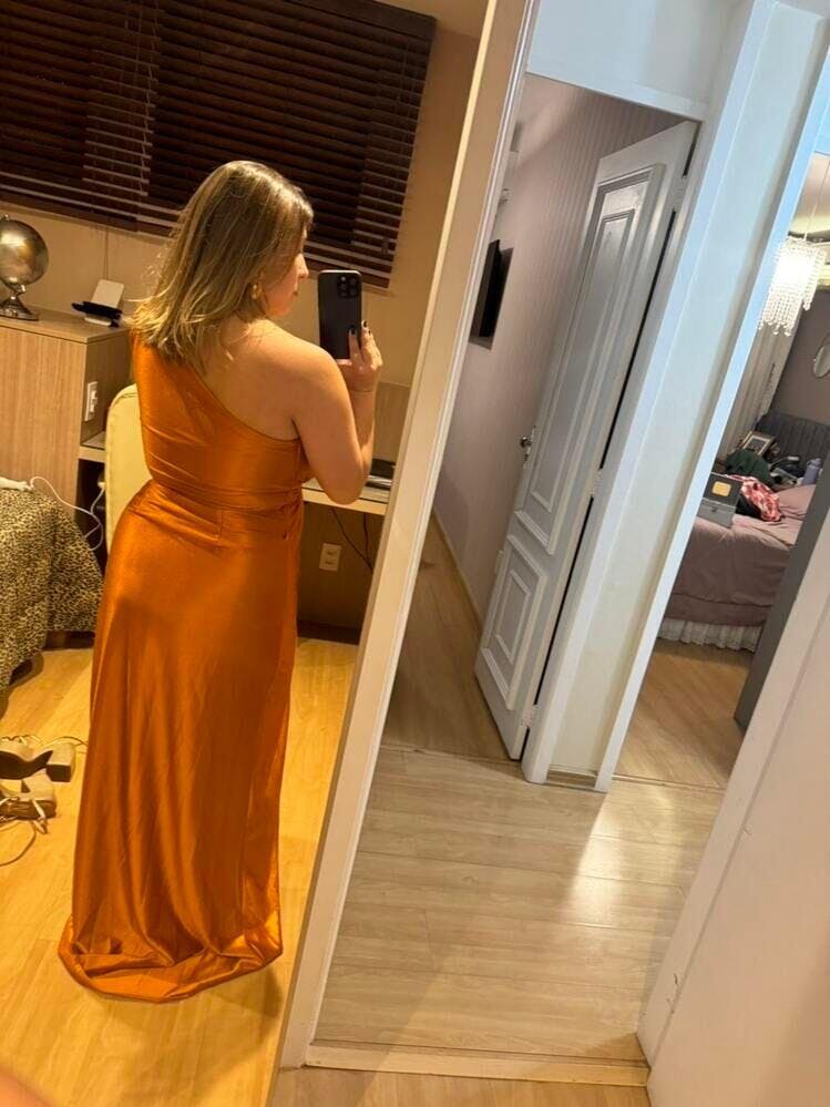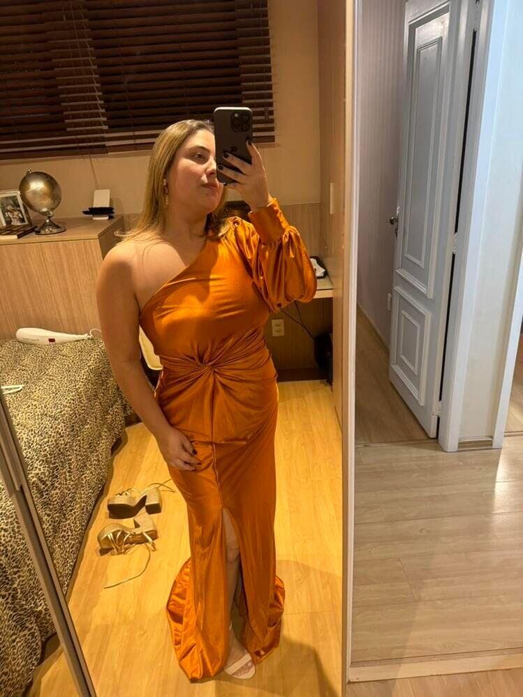 O Paola combina o luxo do cetim com um corte moderno que valoriza a silhueta e transmite confiança. O decote de um ombro só junto à manga longa com fenda cria equilíbrio entre elegância e ousadia, enquanto o torcido frontal desenha a cintura e a fenda lateral garante movimento e destaque. É um vestido que transforma qualquer entrada em um momento inesquecível.